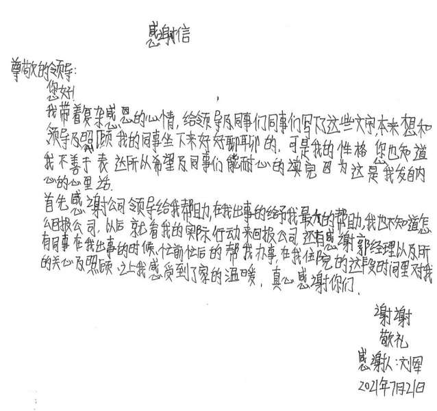 经过半个月治疗休养,刘军手部已无大碍。出院后的他写了一封感谢信并为公司送了一面锦旗,他说道,是米兰MilLan·官方站网页版登录入口-米兰online(中国)这个大家庭让他感受到了关怀和温暖,他表示要把这种关怀变成工作上的动力,争取早日返回工作岗位,努力工作,回报大家的关心和关爱。